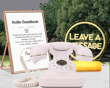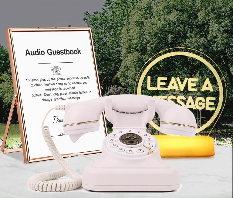 Our Audio Guest Book lets your guests pick up the phone and record heartfelt messages, funny stories, marriage advice, birthday wishes, and unforgettable moments you’ll cherish forever.